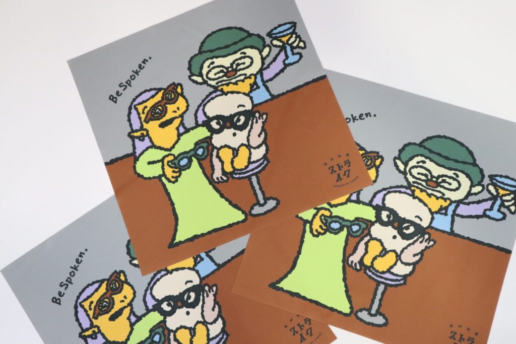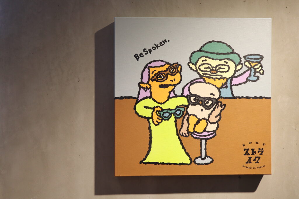 「めがね拭き」というプロダクトとアート作品が自然になじむよう、櫻井万里明さんの世界観とお店の空気感のバランスを意識しながら企画しました。めがね拭きに使用した原画は、店内で作品としても楽しんでいただけるよう展示しています。