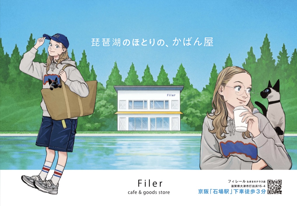 滋賀・大津「なぎさのテラス」にオープンした Filer cafe & goods store の世界観を、京阪電車・石山坂本線と京阪「石山駅」という動線の中で立ち上げることを意識したプロジェクトです。